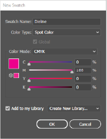 3b. ใส่ “Dieline” Spot Colour ลงบนเส้นขอบงาน(Stroke)ที่ต้องการตัด